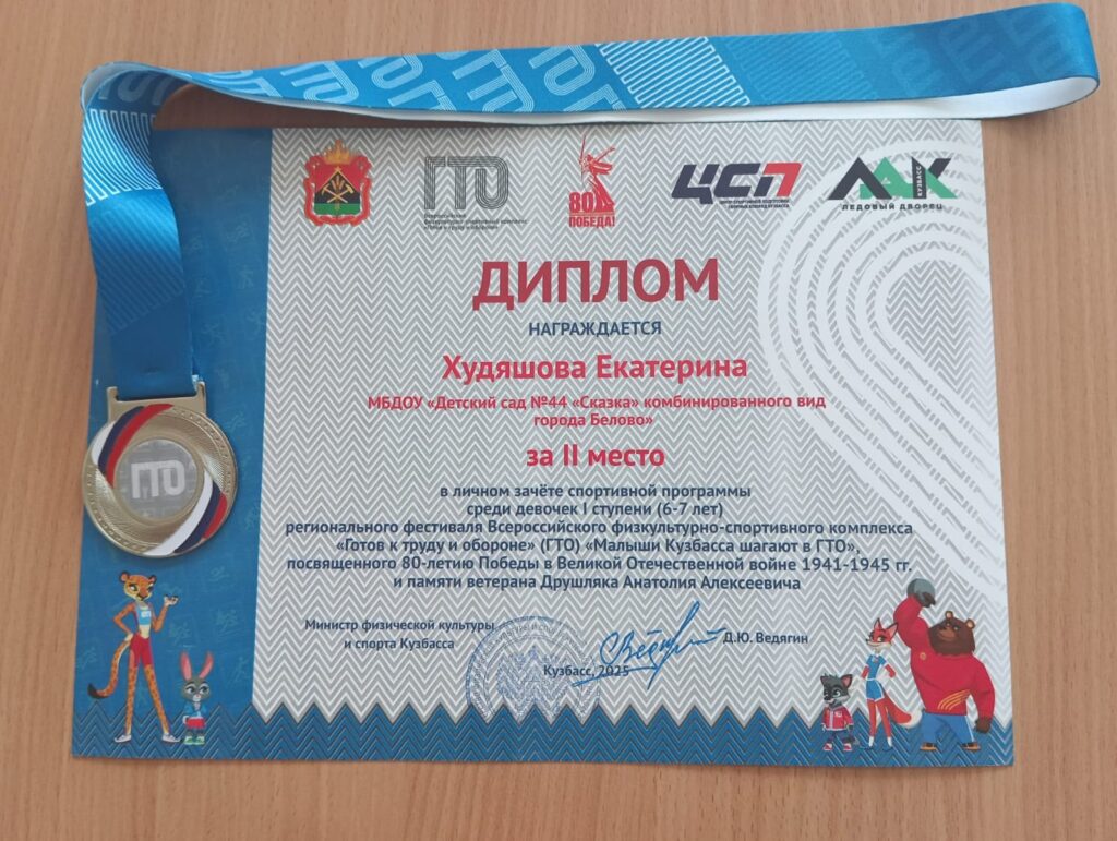 Награждение победителей в региональном фестивале «Малыш шагает в ГТО»В городе Прокопьевске в детском саду прошло награждение победителей. Наша воспитанница заняла второе место в личном зачёте спортивной программы среди 58 девочек. Поздравляем Худяшову Екатерину с победой! Желаем дальнейших достижений!